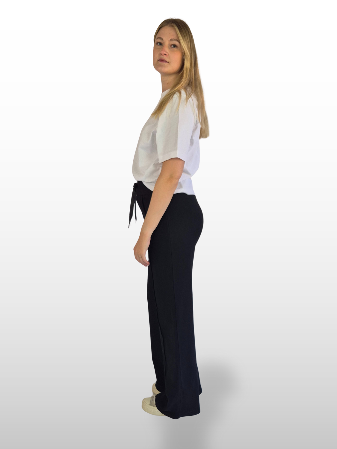 Das zeitlose Design in klassischem Schwarz wird durch den breiten Gummibund mit Kordelzug ergänzt, der für perfekten Halt und eine flexible Passform sorgt. Der gerade Schnitt (Straight Fit) verleiht der Hose eine fließende, stilvolle Form, während die weite Beinpartie (Wide Leg) für Bewegungsfreiheit und ein angenehmes Tragegefühl steht.