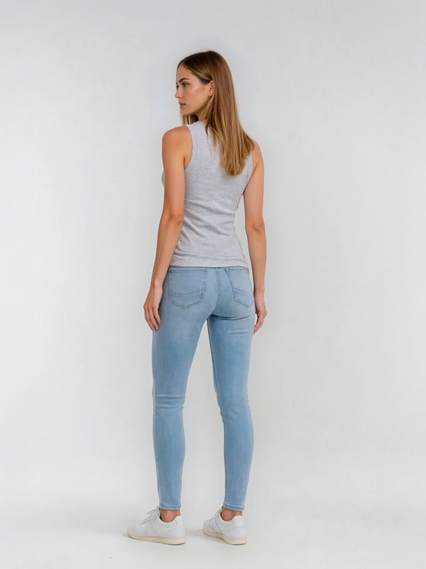 Gefertigt aus superweichem Power-Stretch Denim, schmiegt sich die Jeans wie eine zweite Haut an und bietet gleichzeitig maximale Bewegungsfreiheit. Die sommerlich-helle Waschung verleiht ihr einen frischen, modernen Look, der sich vielseitig kombinieren lässt, ob mit High Heels für einen eleganten Auftritt, Sneakern für den Alltag oder Stiefeln für die kühleren Tage.