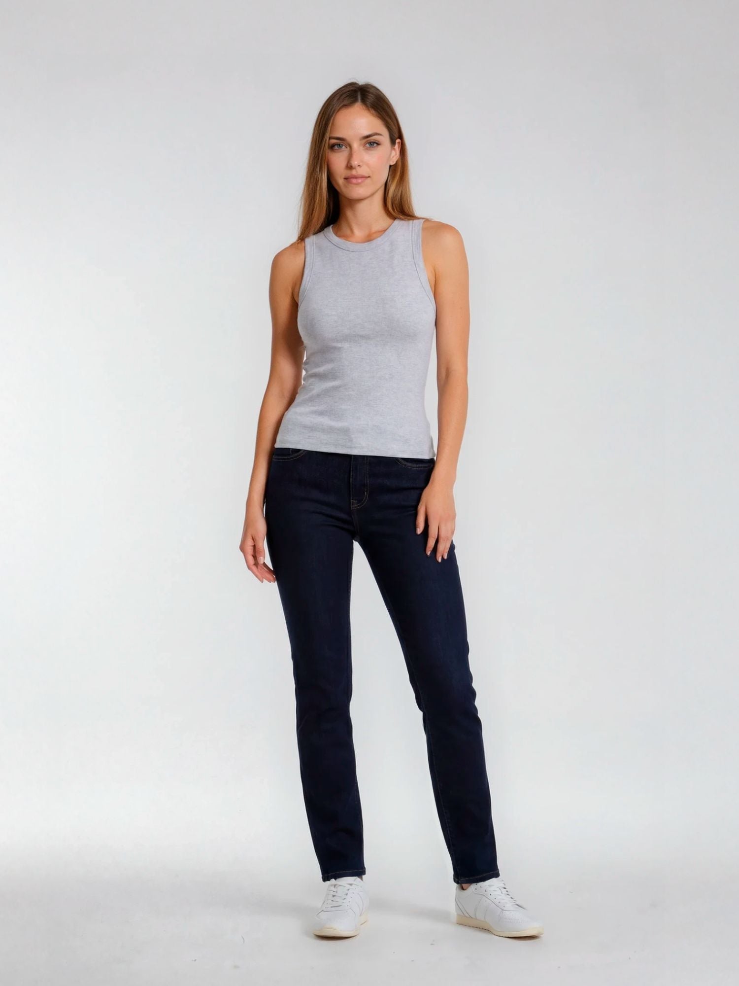 Dank des hochwertigen Denim-Materials mit Stretchanteil passt sich die Hose perfekt der Körperform an, bleibt dabei formstabil und bietet maximale Bewegungsfreiheit. Der Stoff ist angenehm weich und langlebig, was die Jeans zu einem zuverlässigen Begleiter für viele Gelegenheiten macht. Die hohe Taille betont die Körpermitte und streckt optisch das Bein, eine Passform, die besonders große Frauen schmeichelt und die Silhouette elegant verlängert.