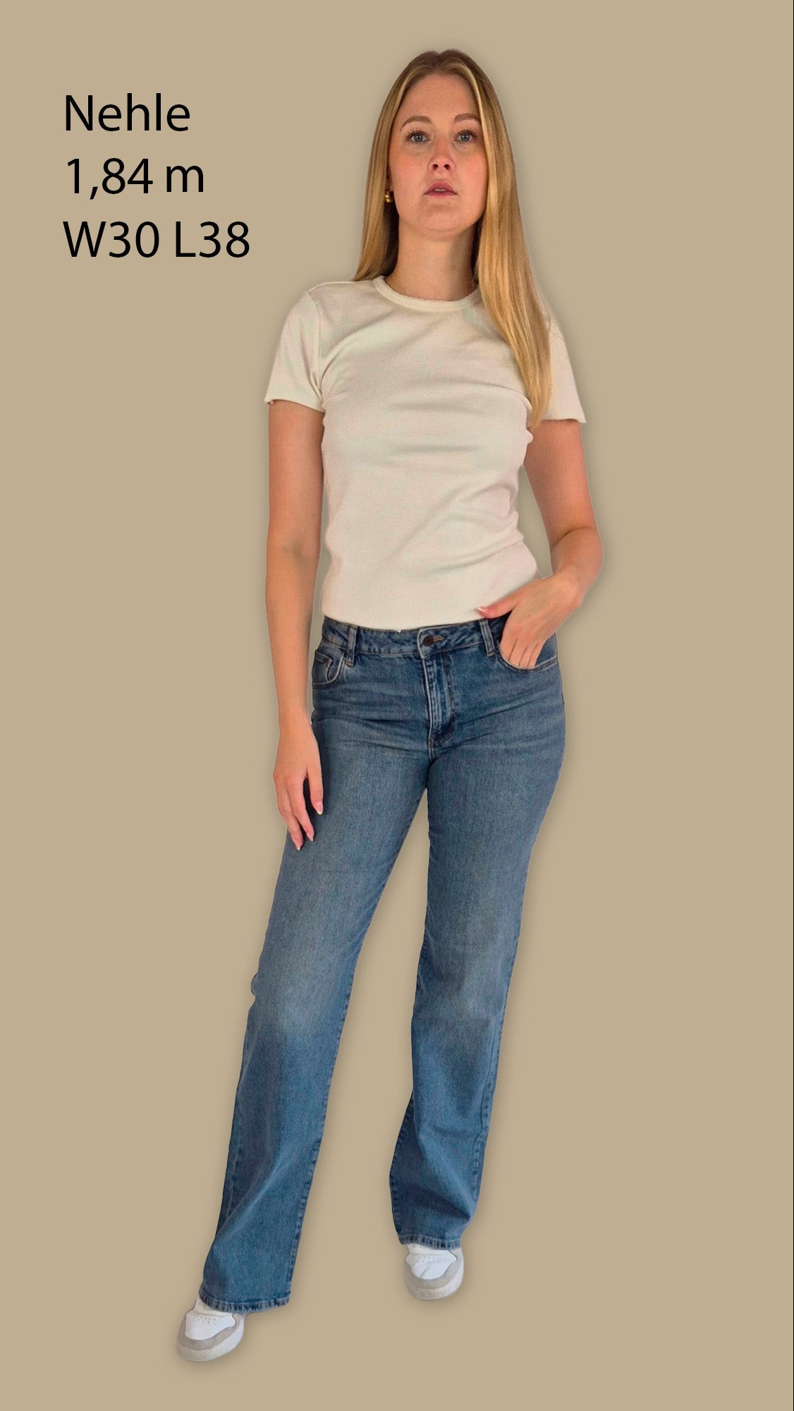 Nehle ist 1,84 m groß und trägt Weite 30 / L38 bei einer Innenbeinlänge von 96 cm