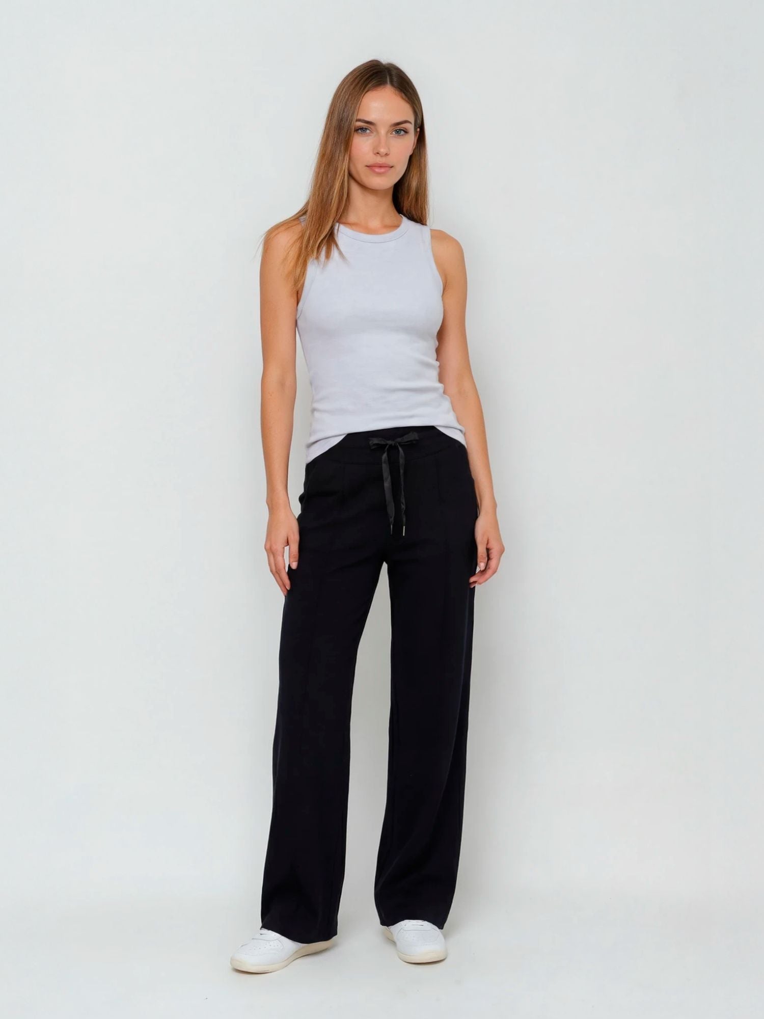 Das zeitlose Design in klassischem Schwarz wird durch den breiten Gummibund mit Kordelzug ergänzt, der für perfekten Halt und eine flexible Passform sorgt. Der gerade Schnitt (Straight Fit) verleiht der Hose eine fließende, stilvolle Form, während die weite Beinpartie (Wide Leg) für Bewegungsfreiheit und ein angenehmes Tragegefühl steht.